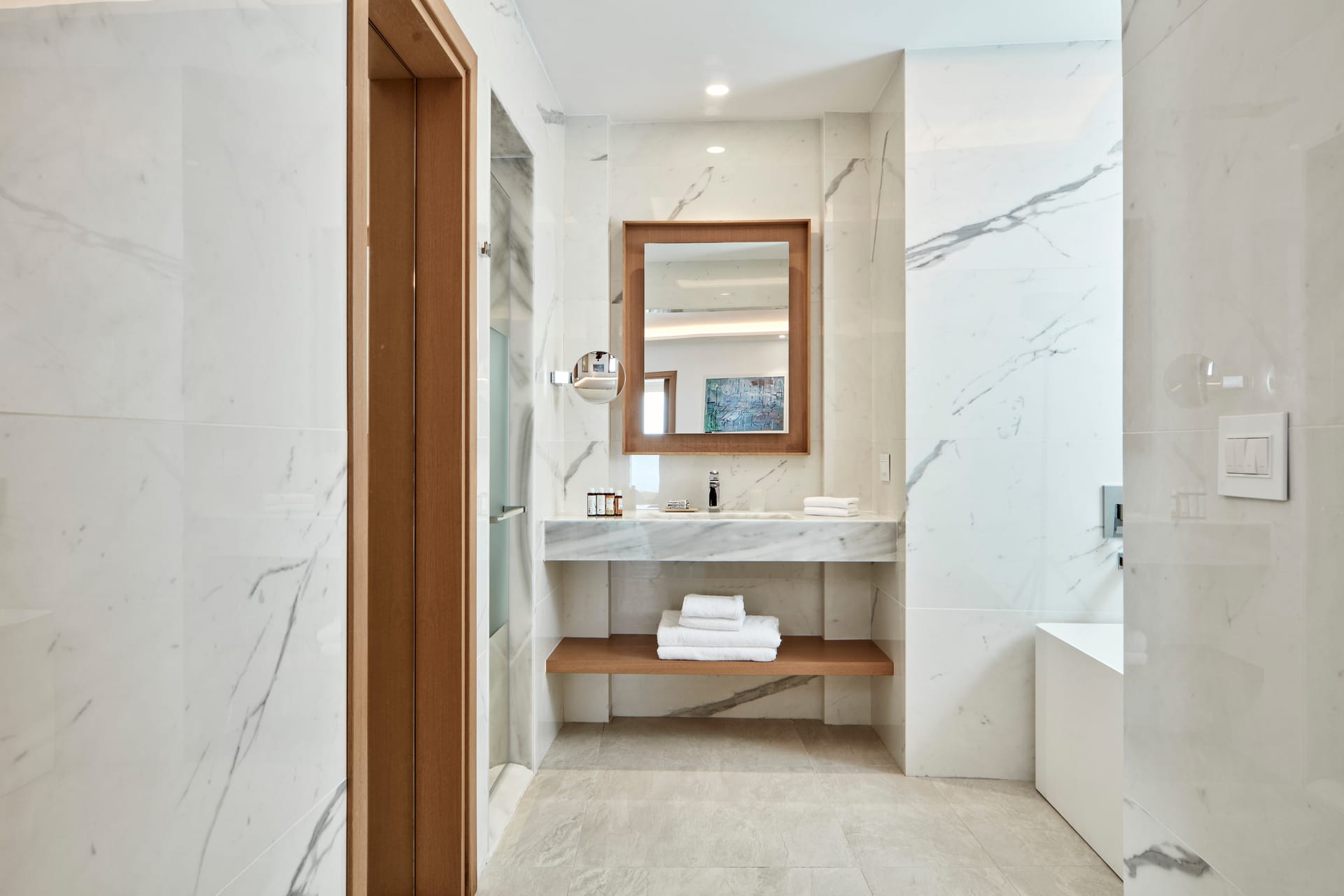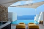 The suite features details of Aegean-inspired architecture with modern, contemporary sophisticated interiors, and outdoor jacuzzi, a private pool and sunbathing terrace overlooking Myconos Town and the Aegean Sea.