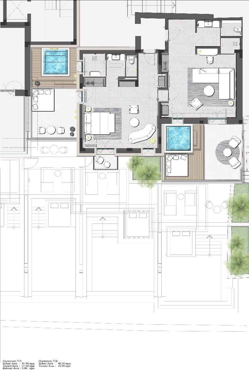 The SIGMA One Bedroom Residence is a room that distils all the magic of Deos, as a self-contained haven of privacy opening out onto a furnished terrace with hot tub and lovely views. The luminous interiors include an elegant semi-open marble bathroom discreetly screened from the living area. Natural textures and custom design tell an authentic story of artisanal skills and locally sourced materials with casual refinement. The king-sized or queen beds sleep two guests, there's a pillow menu, block-out blinds and silent aircon to ensure deep rest and relaxation. Tech features include fast Wi-Fi, Marshall speakers and Samsung flatscreen TV.