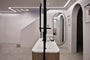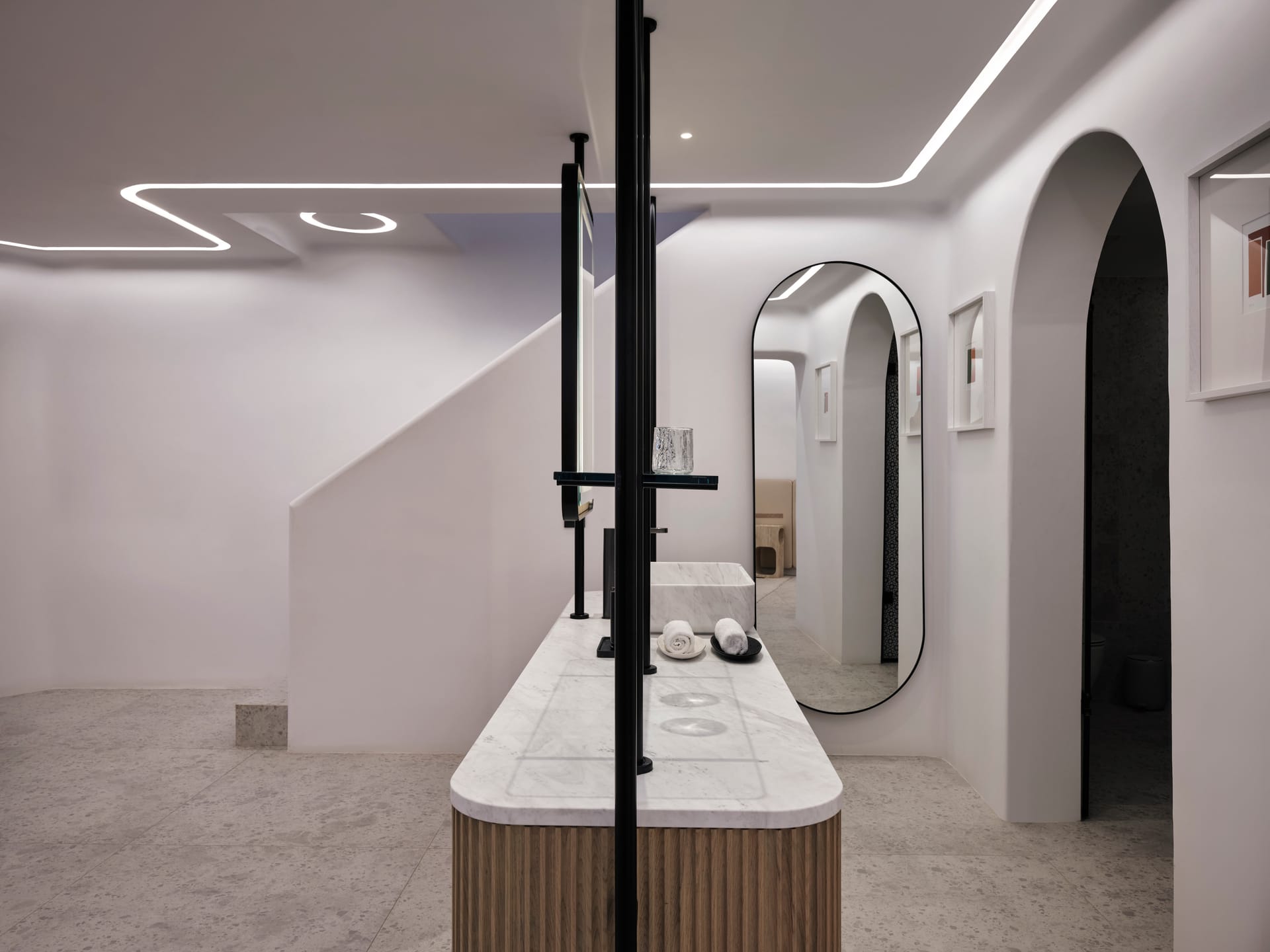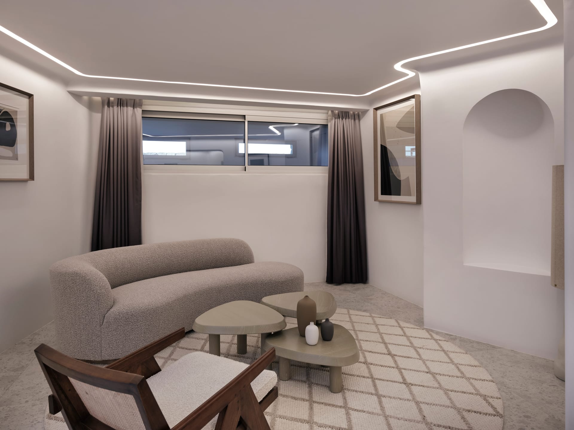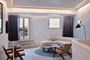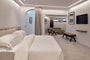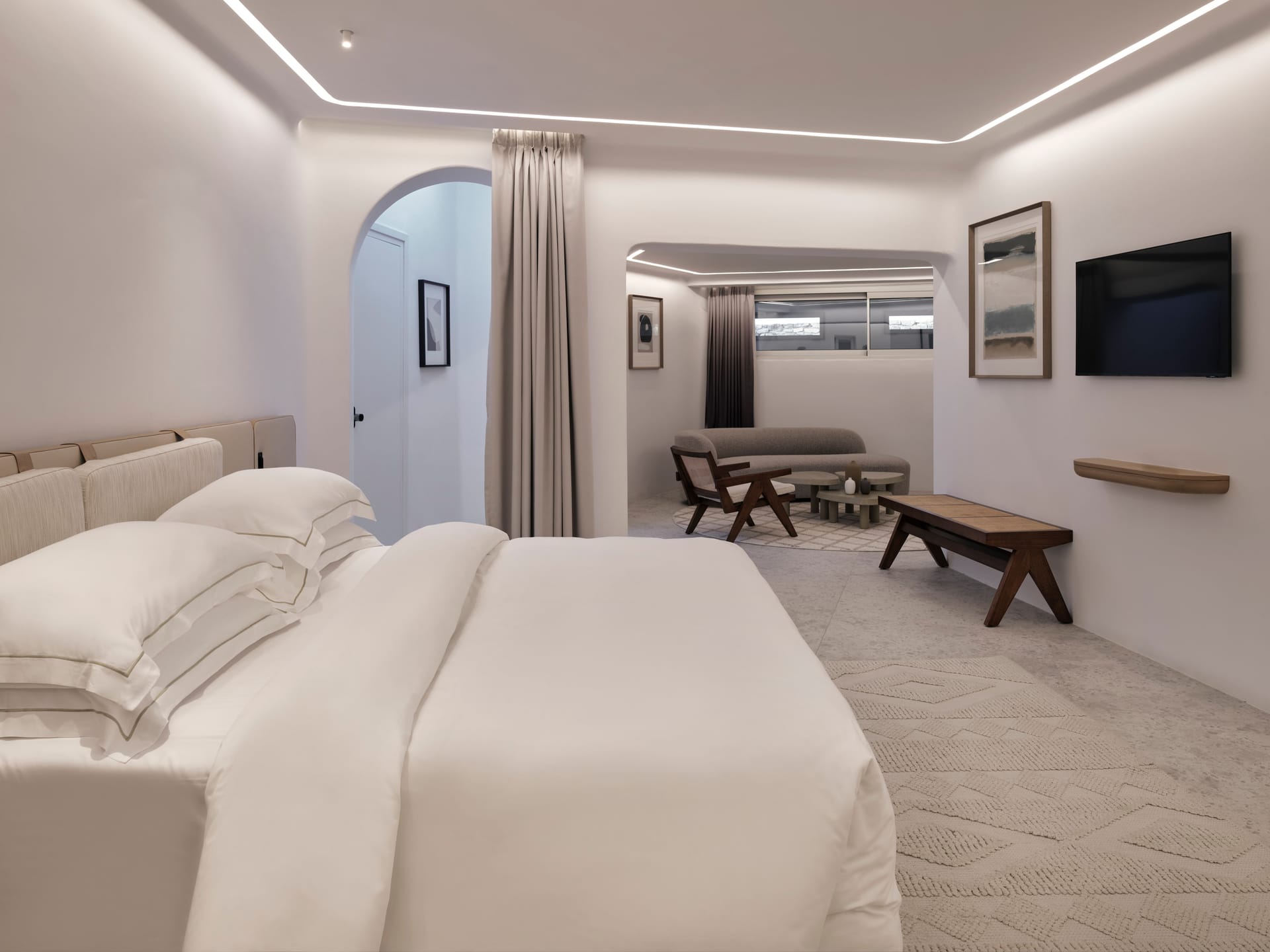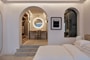 The decor exudes a warm minimalism and borrows from the traditional organic forms, arches and clerestory windows of the Cycladic vernacular, enhanced by the meticulous craftsmanship of custom designs employing natural and local materials.