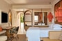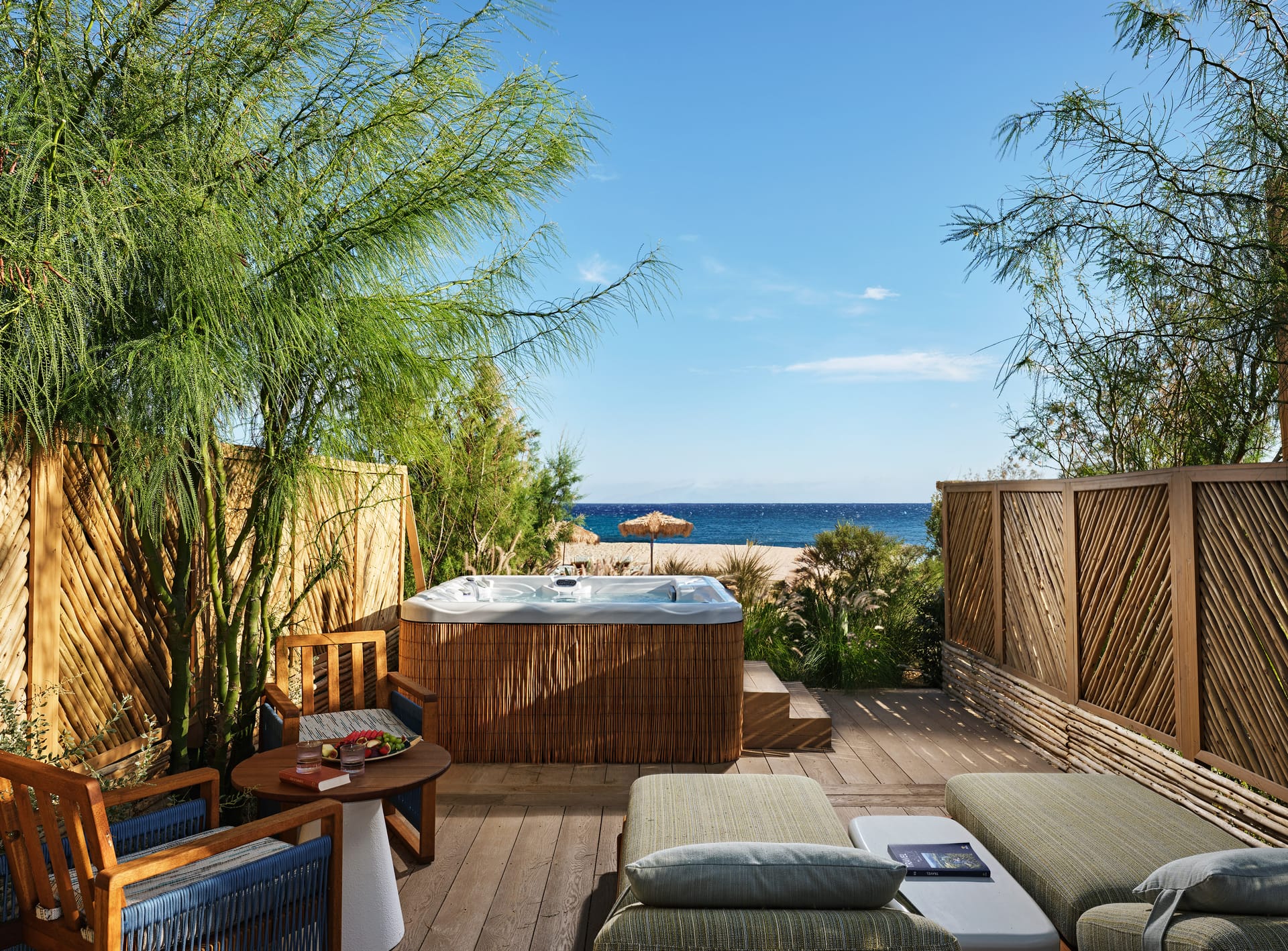 2 king size beds (or twin bedding) and 1 sofa bed, Sea View direct on the beach, Ground Floor with a furnished terrace and a private jacuzzi with 2 sunbeds, a table, and chairs, direct on the beach connected via terrace, open space bathroom with separate shower and wc.